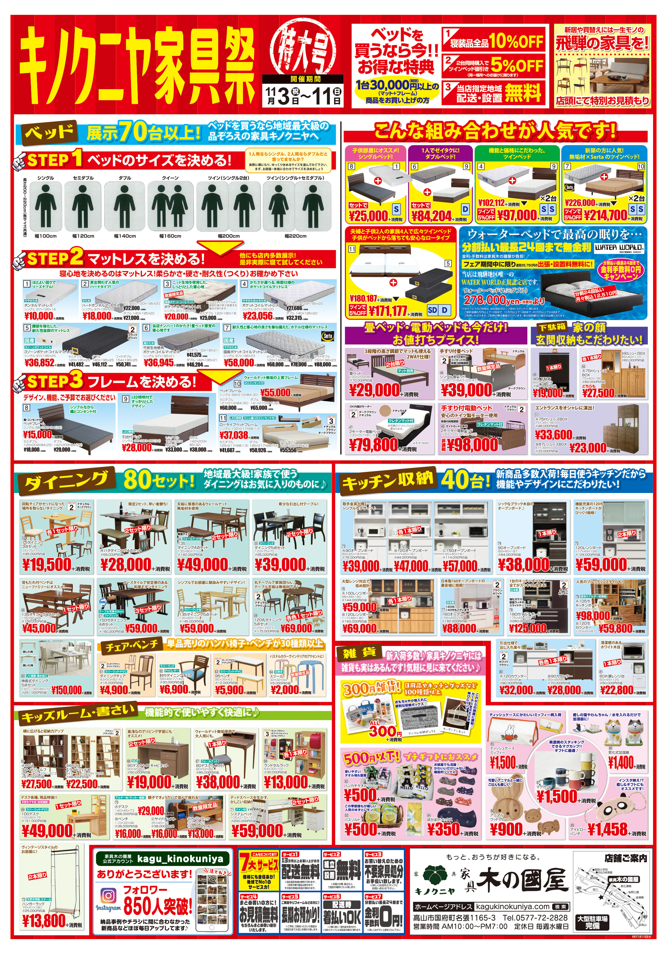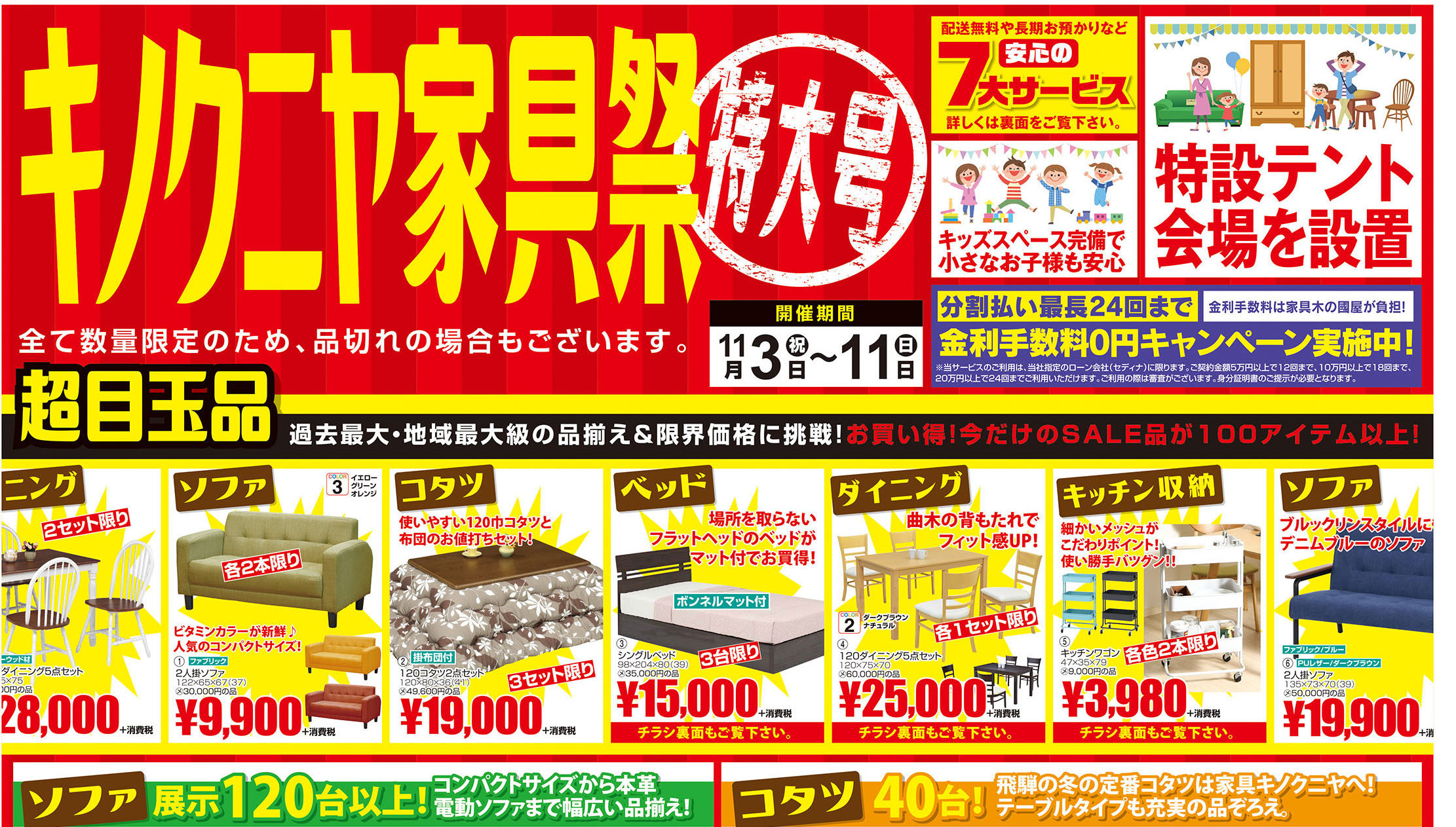 【チラシ】11月3日~キノクニヤ家具祭 特大号!目玉アイテムが100商品以上!