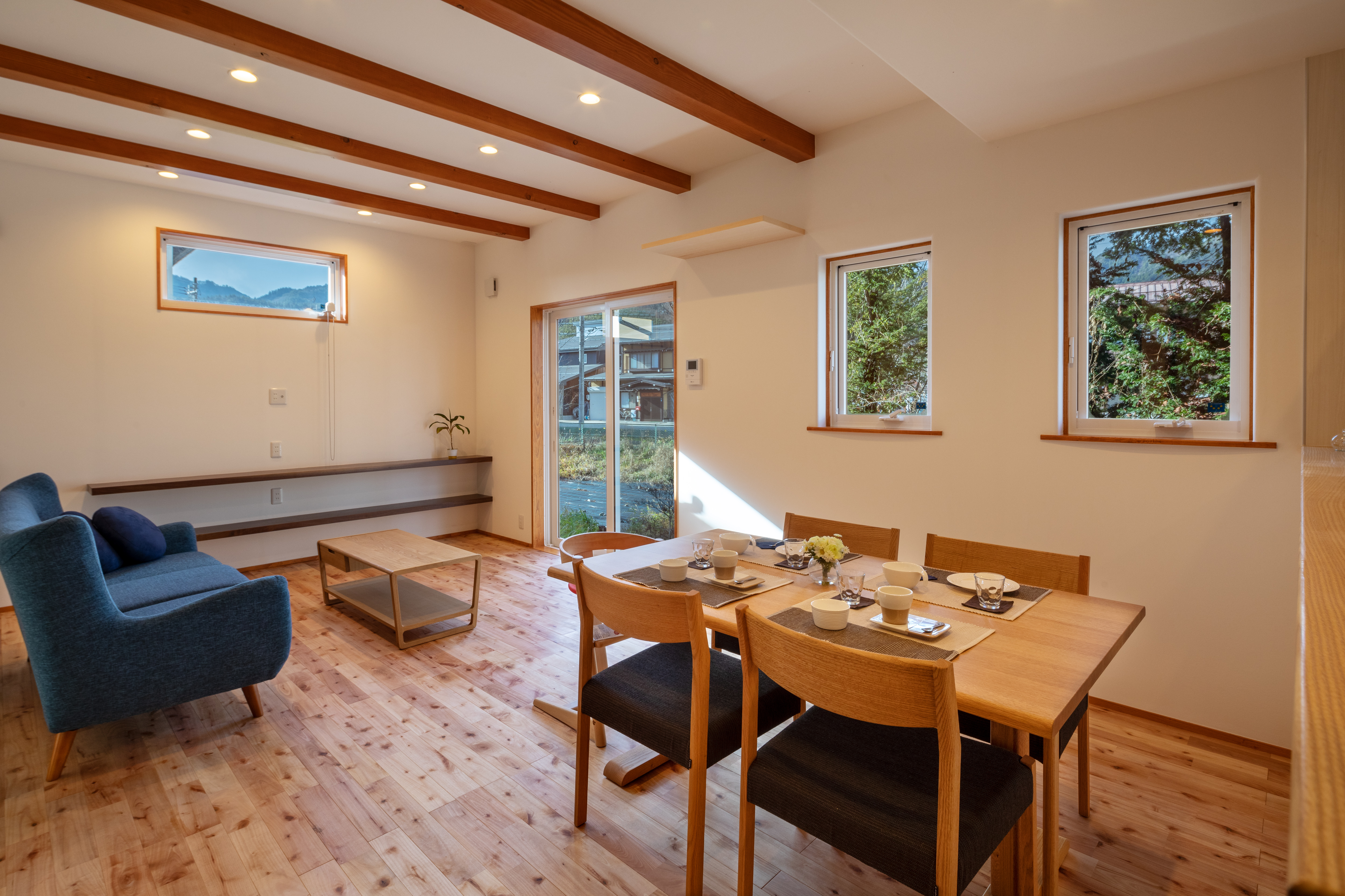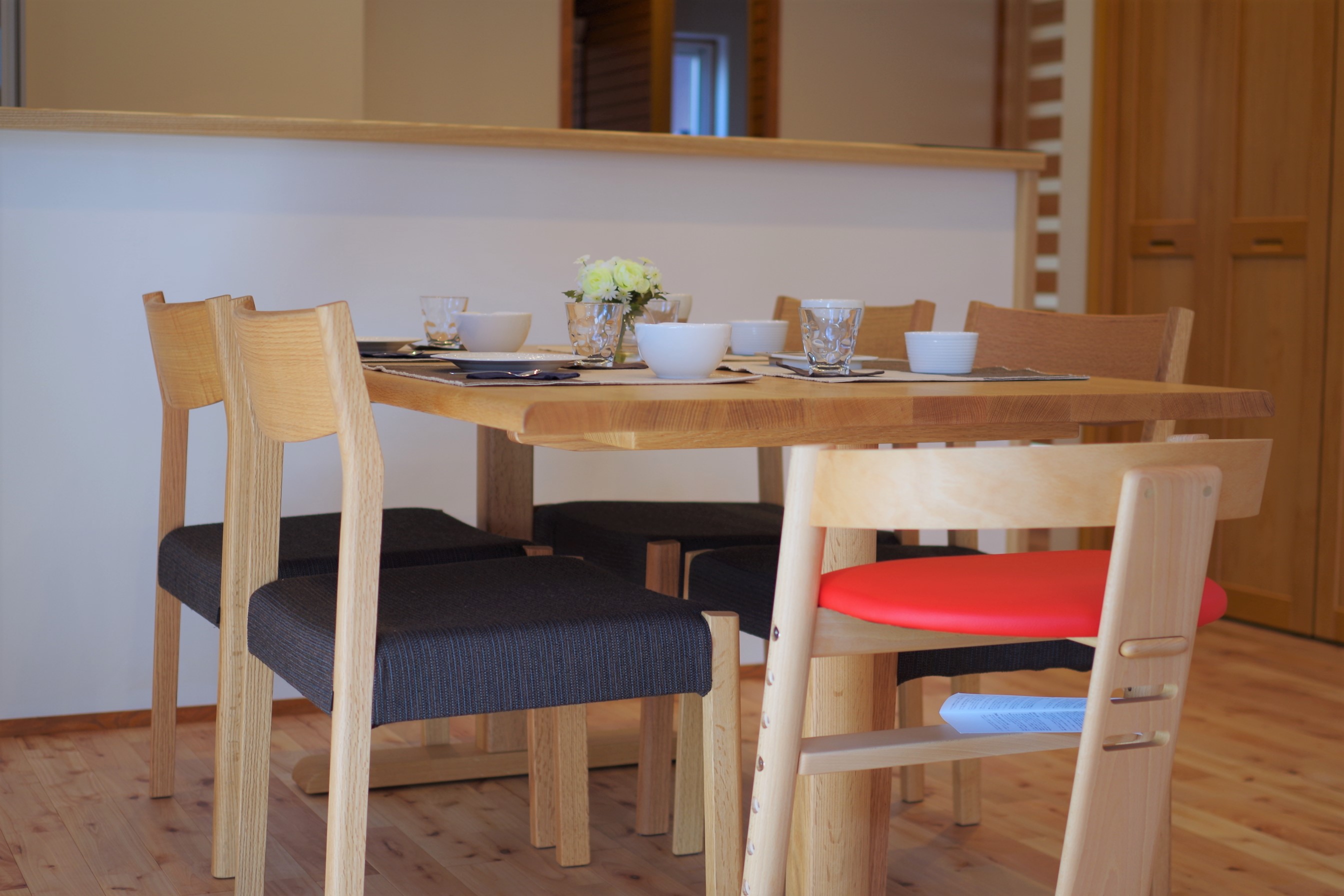 ▲今回は無垢の床の存在感に負けないように飛騨産業さんのダイニングセットを納品しました。
