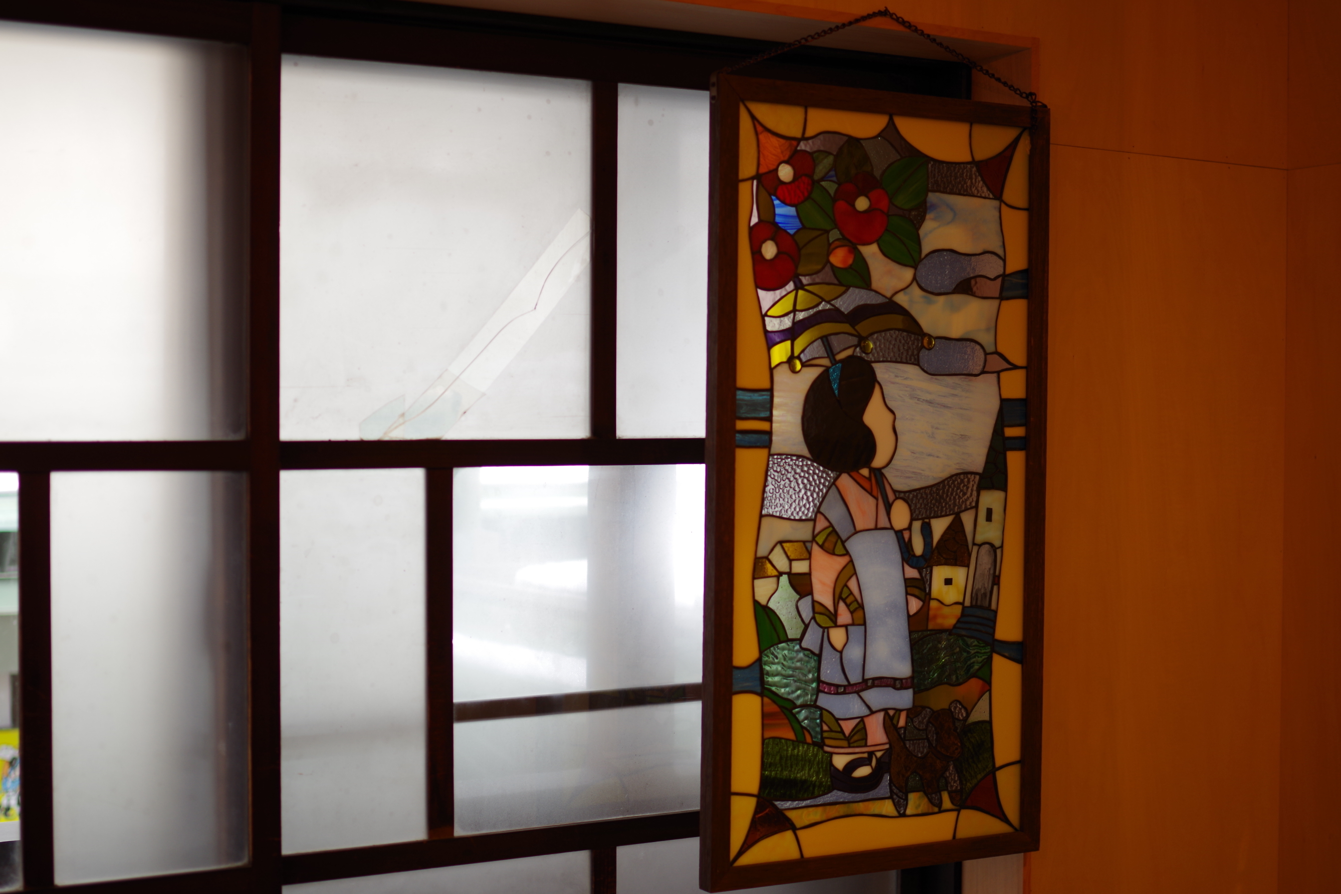 レトロな文字盤の掛け時計、窓は昔から使っていたものをそのまま活用し、レトロな雰囲気のステンドグラスはお客様のお母さんが作ったものだそうです。