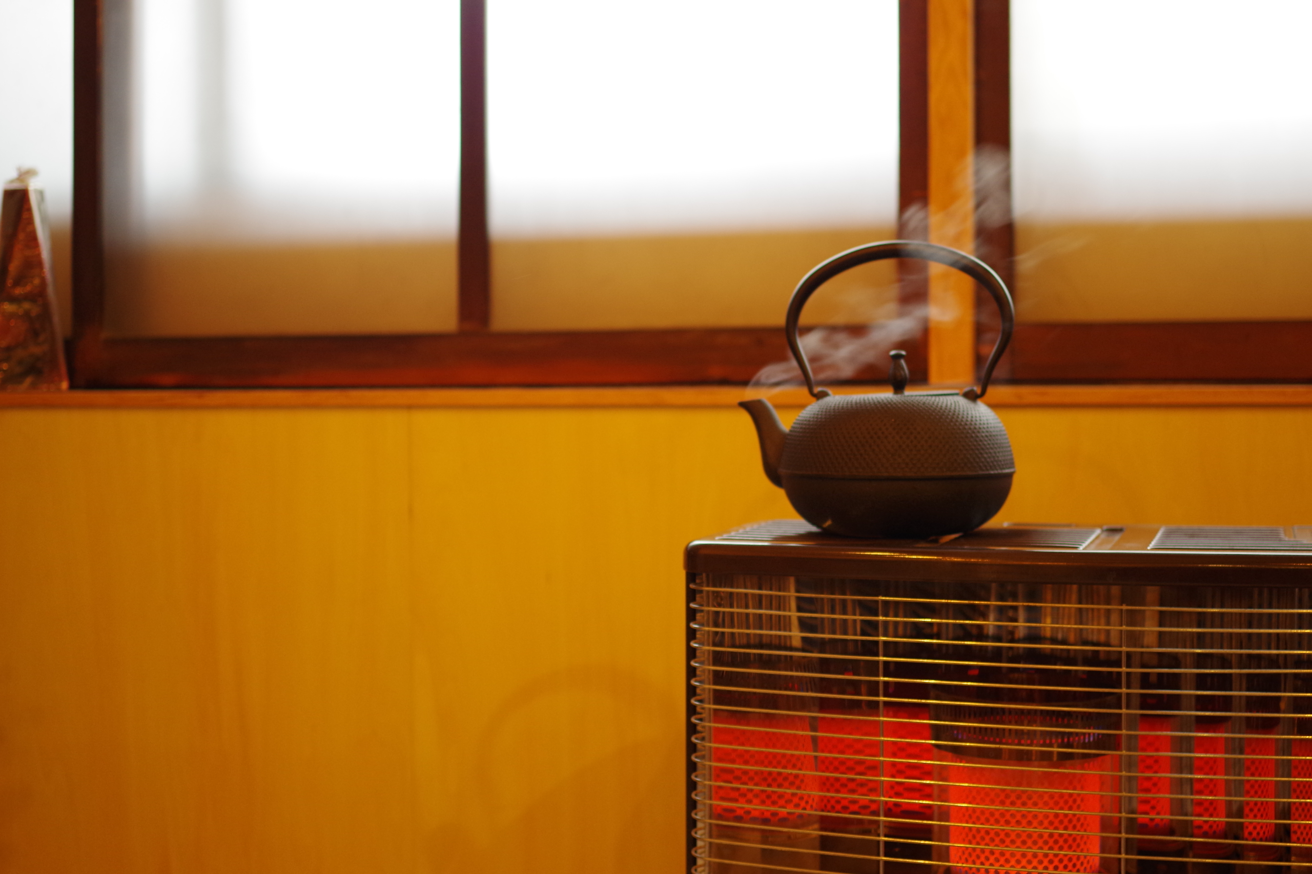 2階のカフェに上がると、どこか懐かしいストーブと鉄瓶がお出迎えしてくれました。